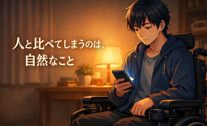 私自身も例外ではありません。とても比べやすい性格で、承認欲求も強く、「誰かに認められたい」という思いに振り回されることがしばしばあります。障害があると、日常の中でどうしても他者の支援が必要になります。そのため「嫌われたら、支援を受けられなくなるかもしれない」という恐怖感や不安感がつきまとい、ますます「人からどう思われているか」を気にしてしまうのです。